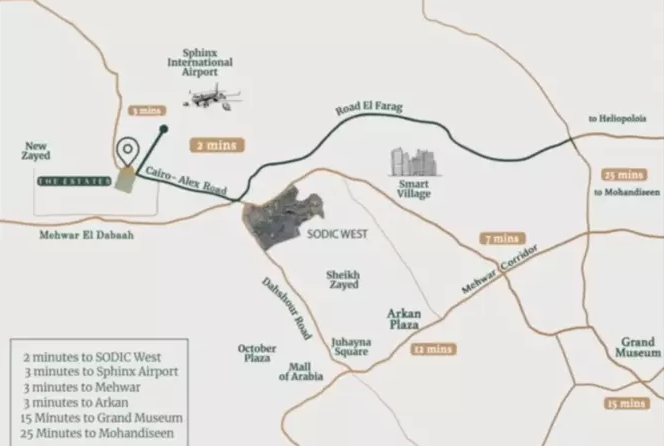 - يمكن الوصول بسهولة خلال دقائق إلى الكمبوند عبر طريق القاهرة اسكندرية الصحراوي.